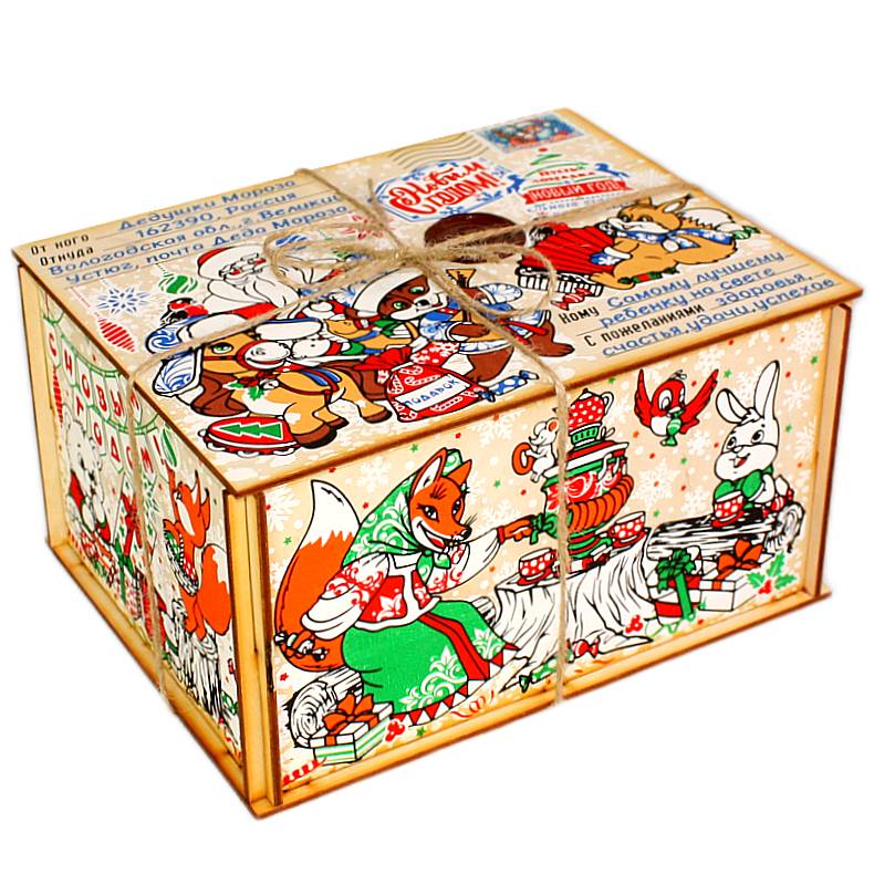 Детский новогодний подарок в упаковке из фанеры весом 950 грамм