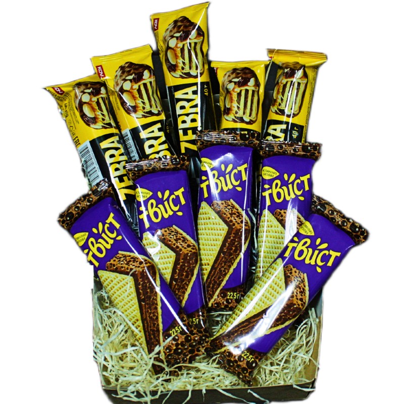 В составе подарочного набора вафли в шоколаде Zebra и вафли с воздушной начинкой Твист от компании КДВ. Набор упакован в подарочную крафт-коробку, перетянутую красной лентой и тщательно упакован в транспортную упаковку для защиты от повреждений.